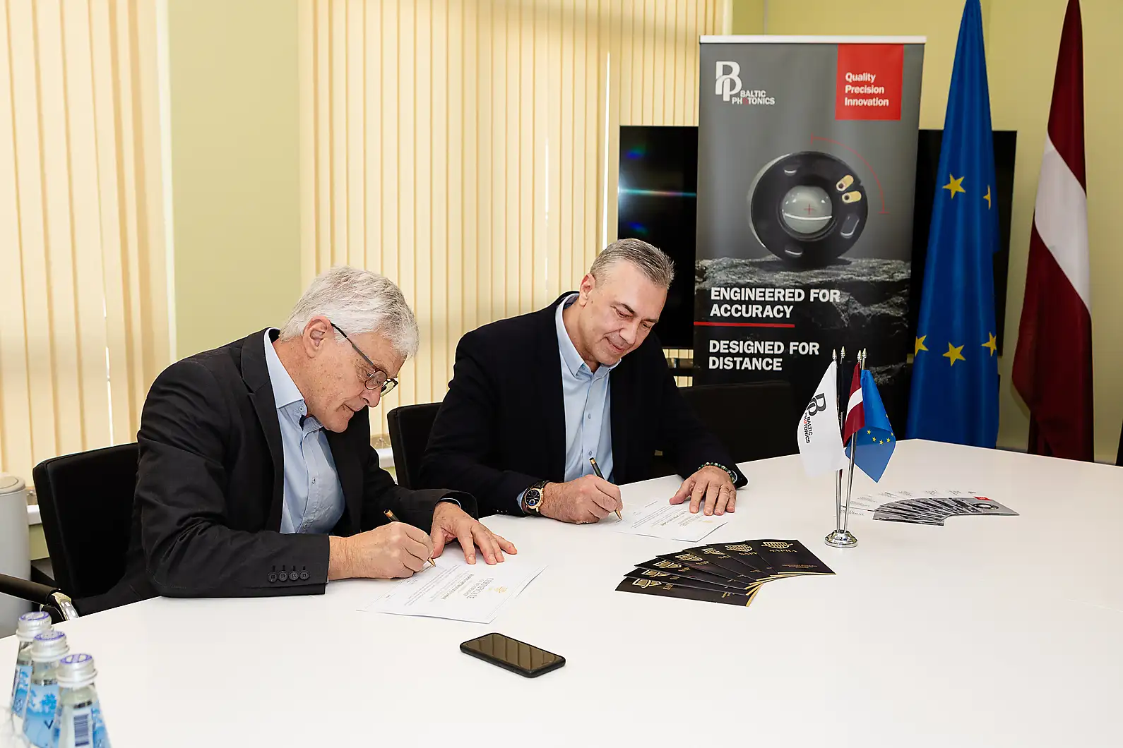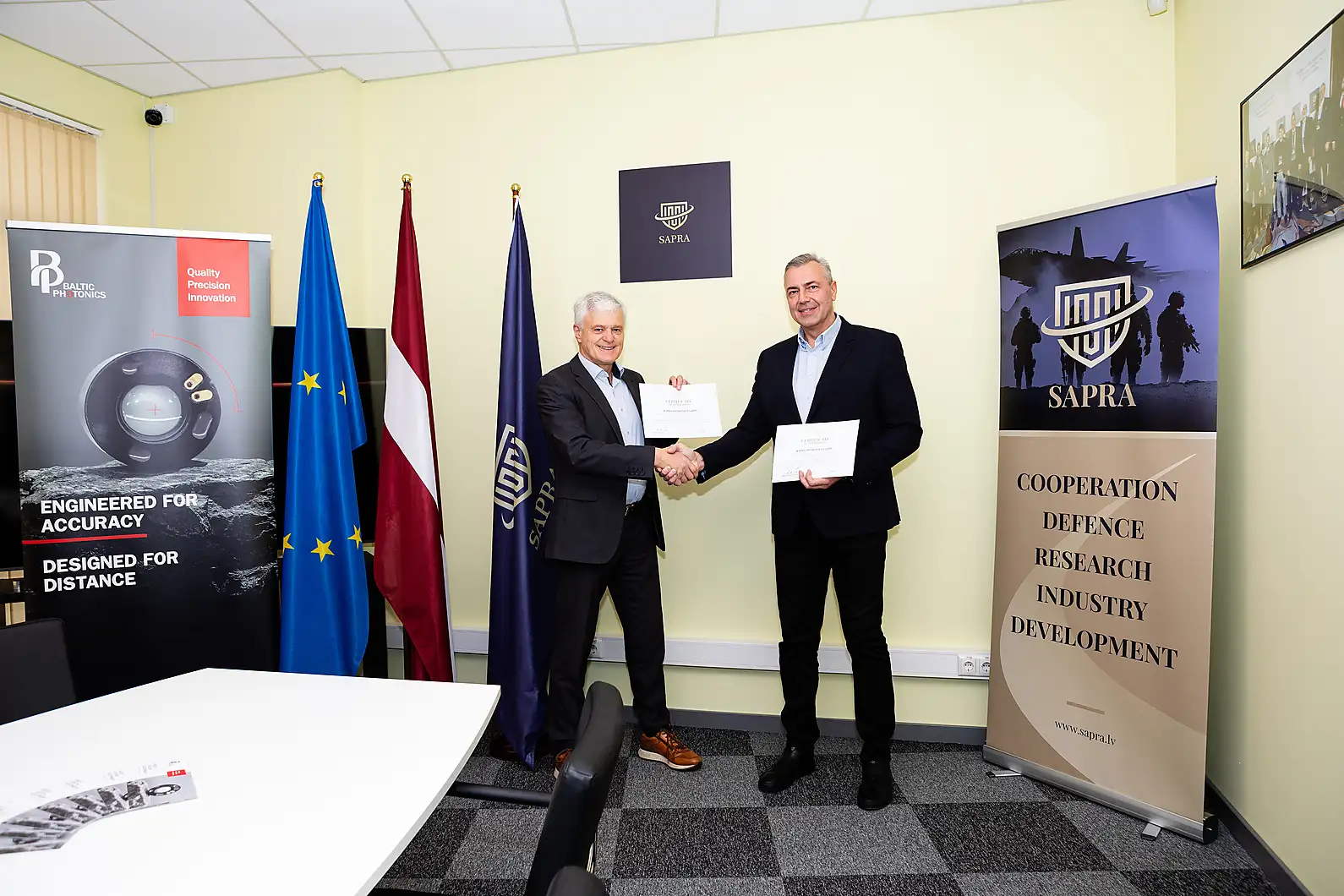 The certificate was signed by Edgars Zandmanis, Chairman of the Board of SAPRA, and Christian Henn, Business Development Manager at Kappa Optronics.